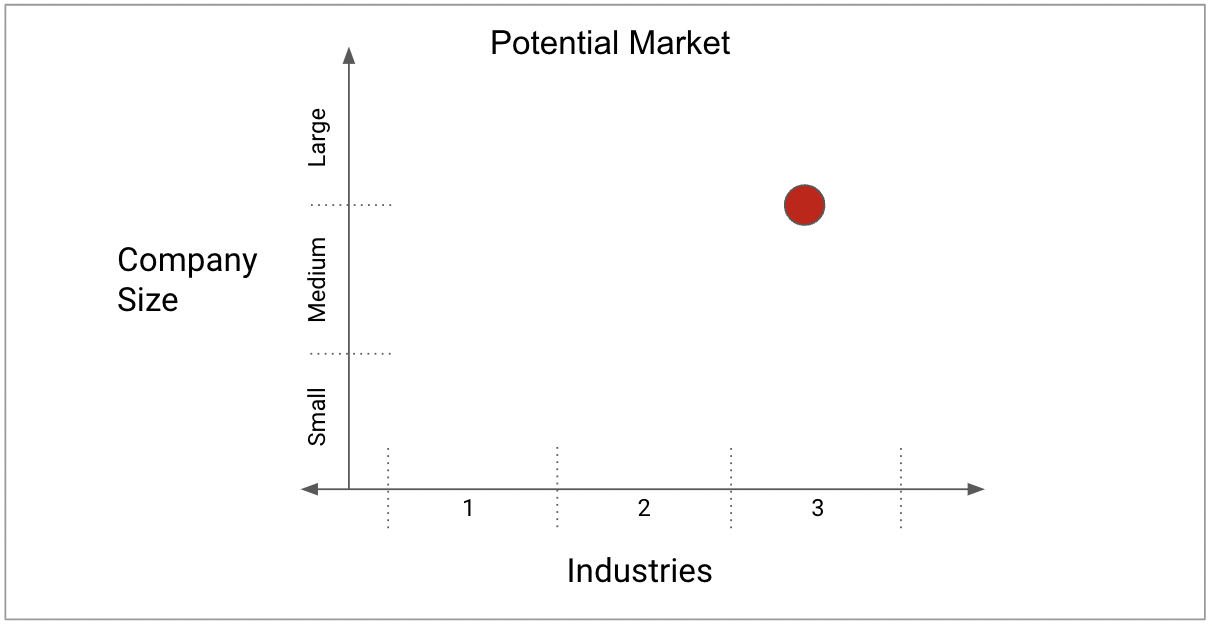 This represents the market, where on the x-axis you have various industries (although in the real world there are often no clear lines separating them) and the y-axis indicates the size of client/customer companies. (There is no one objective way to define “size.” Revenue, headcount, market cap, market share, number of locations — you can define it however you like.)