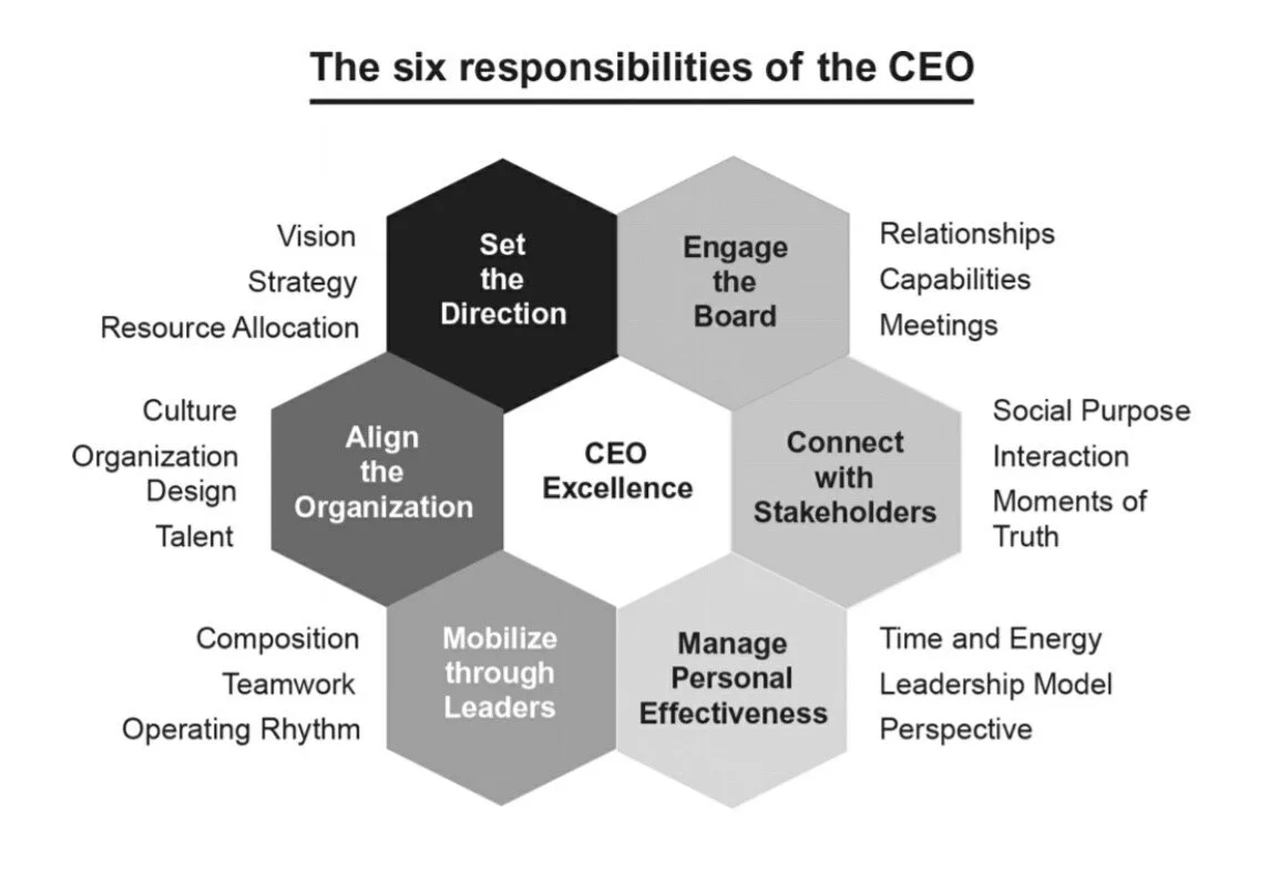 When I stepped into the role, I rushed to fill the gaps in my experience by reading and meeting with current and former CEOs. There’s been a ton of learning over this period, and I’ll try to write about it more as time goes on. But today, I want to unpack a framework from a book, one of my favorite reads in the past couple of years, called CEO Excellence. What I found helpful about this framework is that it very clearly articulated what exactly a CEO should do. It’s saved on my phone, and over the past year and a half I’ve kept coming back to it whenever I needed direction. So this framework stood the test of (at least some) time and has proven to be useful, which is why I feel comfortable sharing it.